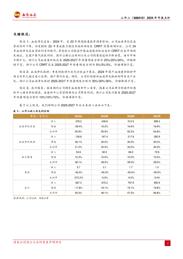 基于国内招标逐步恢复和海外扩张持续加速的预期,西南证券预测公司2025-2027年归母净利润将分别达到1.4亿元、1.6亿元和1.9亿元,对应PE分别为27倍、24倍和20倍,建议保持关注。关键假设包括:血液透析机设备2025-2027年销量增速20%,CRRT设备销量增速5%;血液净化耗材销量增速30%;医疗服务销量增速10%,价格均保持不变。同时,报告提示了新品研发失败、设备市场竞争激烈以及部分核心原材料进口采购等风险。