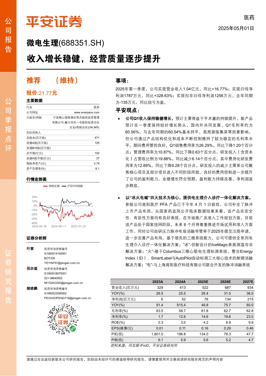 微电生理一季度业绩表现出色,收入稳健增长,盈利能力显著提升,费用管控良好。