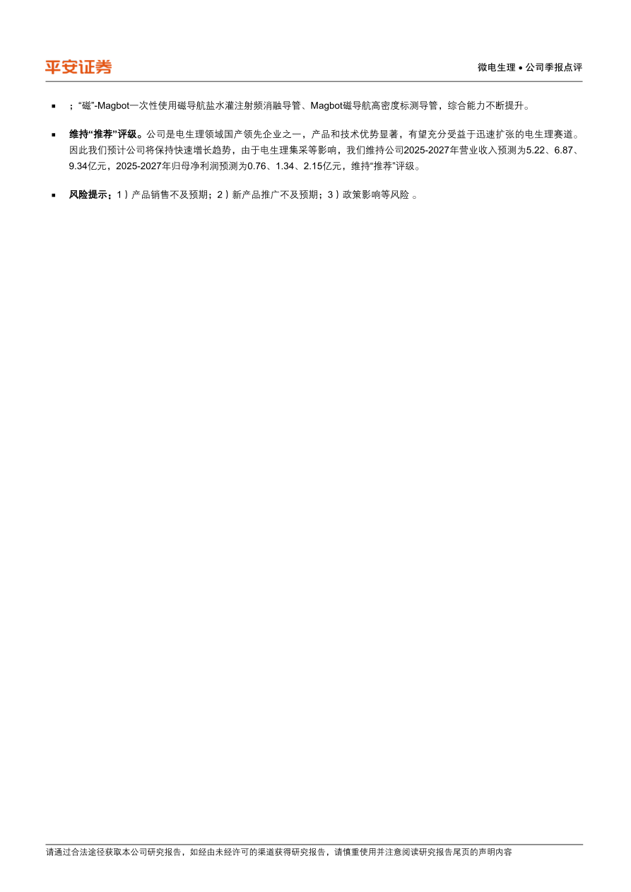 因此我们预计公司将保持快速增长趋势,由于电生理集采等影响,我们维持公司2025-2027年营业收入预测为5.22、6.87、9.34亿元,2025-2027年归母净利润预测为0.76、1.34、2.15亿元,维持“推荐”评级。
