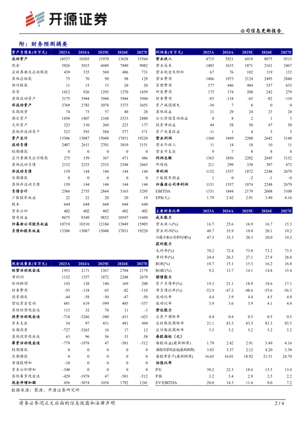 公司2025年第一季度财务表现强劲,实现营业收入17.19亿元,同比增长18.24%。归属于母公司股东的净利润达到4.25亿元,同比增长20.25%;扣除非经常性损益的归母净利润为4.16亿元,同比增长26.69%。在盈利能力方面,公司毛利率为73.62%,同比提升1.83个百分点;净利率为24.73%,同比提升0.40个百分点。费用端控制良好,销售费用率为36.26%,同比下降2.61个百分点;管理费用率为5.04%,同比上升0.45个百分点;研发费用率为2.25%,同比下降0.44个百分点;财务费用率为-0.98%,同比上升1.28个百分点。基于此,分析师维持公司2025-2027年盈利预测,预计归母净利润分别为18.74亿元、22.48亿元和26.79亿元,对应EPS分别为2.91元、3.49元和4.16元,当前股价对应PE分别为18.6倍、15.5倍和13.0倍,维持“买入”评级。