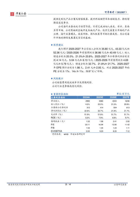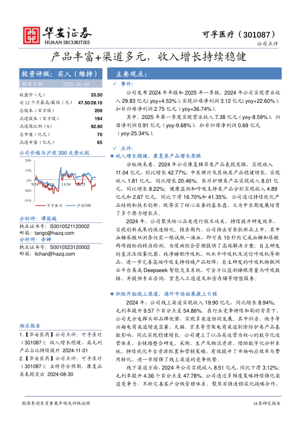 可孚医疗凭借丰富的产品线、多元化的渠道布局以及持续的技术创新,在2024年实现了稳健的收入增长和显著的净利润提升。其中,康复辅具类产品表现亮眼,线上渠道优势明显,海外市场也在积极拓展。华安证券维持对可孚医疗“买入”的投资评级,并对其未来几年的收入和盈利能力进行了预测。同时,报告也提示了销售费用投放效率和行业竞争格局等潜在风险。