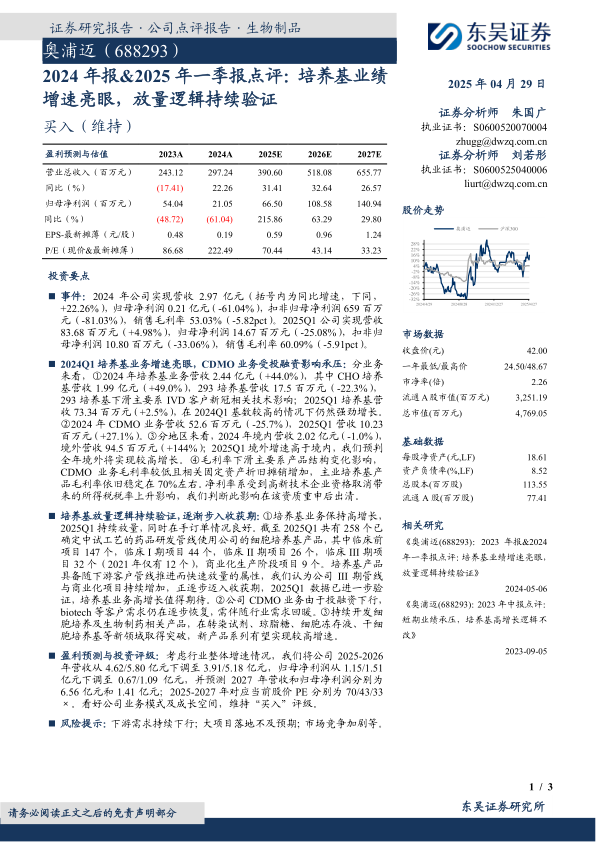奥浦迈在2024年及2025年一季度表现出培养基业务的强劲增长,尤其CHO培养基营收大幅提升,验证了其产品随下游客户管线推进而放量的核心逻辑。尽管CDMO业务受行业投融资影响短期承压,且整体净利润受高新技术企业资格取消等因素影响有所下滑,但公司核心培养基业务的高增长、在手订单的良好状况以及不断增加的临床III期和商业化项目,预示着公司正逐步迈入收获期。报告维持“买入”评级,看好公司长期成长空间,但提示了下游需求、大项目落地及市场竞争等风险。