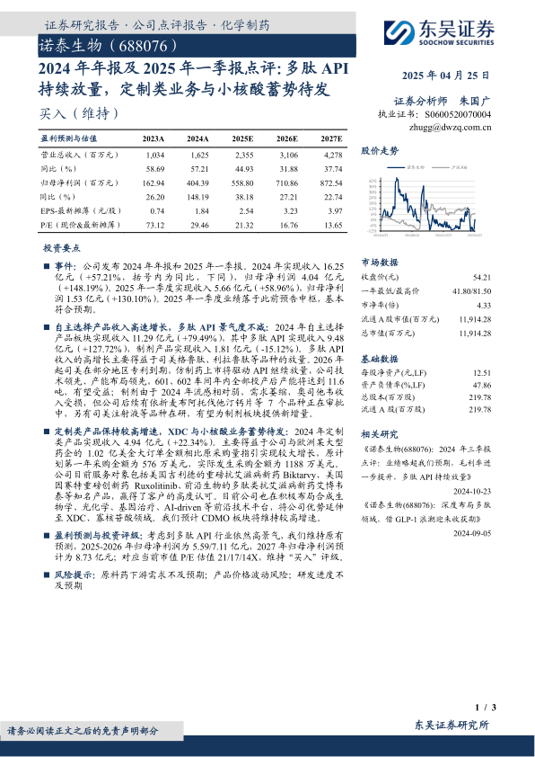 诺泰生物在2024年及2025年一季度取得了显著的业绩增长,核心驱动力在于多肽API业务的强劲放量,特别是司美格鲁肽和利拉鲁肽等品种的贡献。公司通过领先的技术和产能布局,有望持续受益于多肽API市场的景气度,尤其是在司美格鲁肽专利到期后的仿制药市场机遇。同时,定制类产品业务保持稳健增长,并成功拓展了与全球知名药企的合作。展望未来,诺泰生物积极布局XDC、小核酸等前沿生物技术领域,通过多元化战略和技术创新,为公司的长期可持续发展奠定基础。尽管存在下游需求、产品价格和研发进度等风险,但公司整体发展态势良好,盈利能力和市场前景值得期待,维持“买入”评级。