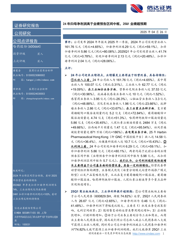 本报告分析了哈药股份(600664)2024年年报及2025年一季报,核心观点如下: