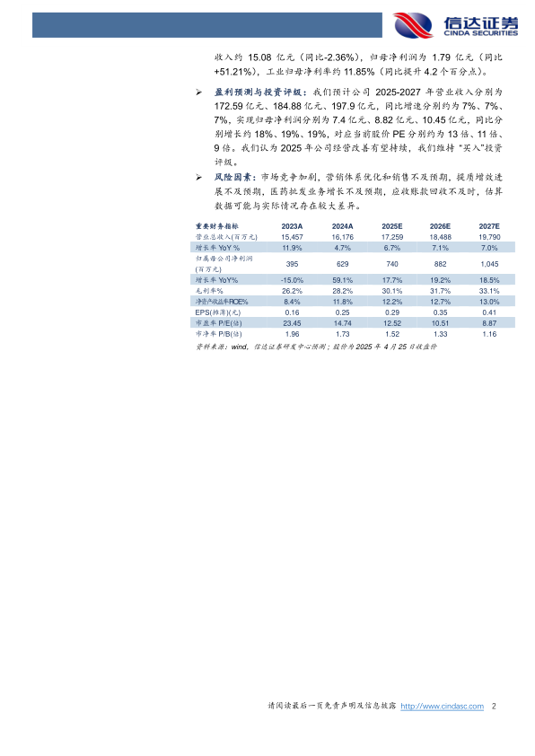 风险因素:市场竞争加剧,营销体系优化和销售不及预期,提质增效进展不及预期,医药批发业务增长不及预期,应收账款回收不及时,估算数据可能与实际情况存在较大差异。