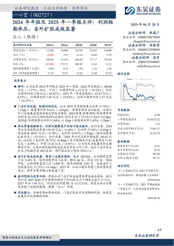 本报告对一心堂(002727)2024年年报及2025年一季报进行了分析,核心观点如下: