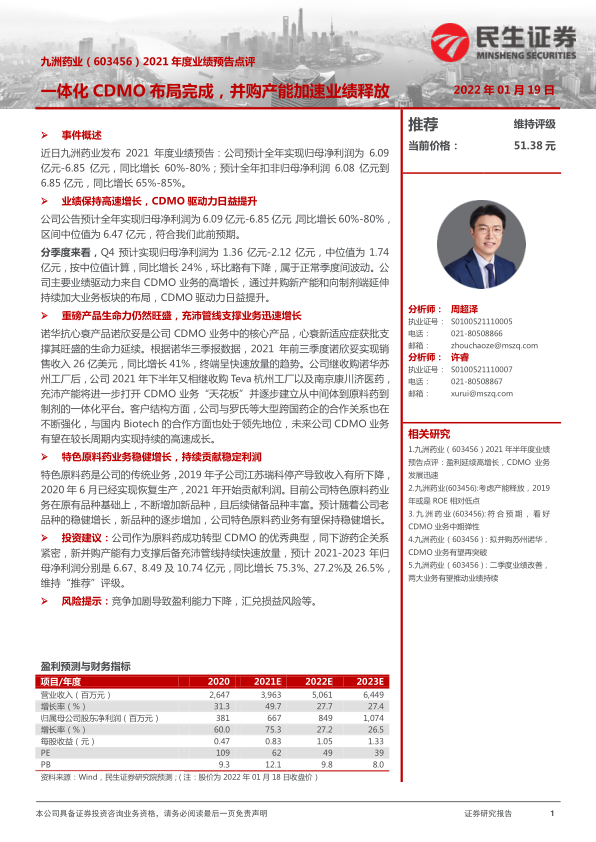投资建议:公司作为原料药成功转型CDMO的优秀典型,同下游药企关系紧密,新并购产能有力支撑后备充沛管线持续快速放量,预计2021-2023年归母净利润分别是6.67、8.49及10.74亿元,同比增长75.3%、27.2%及26.5%,维持“推荐”评级。