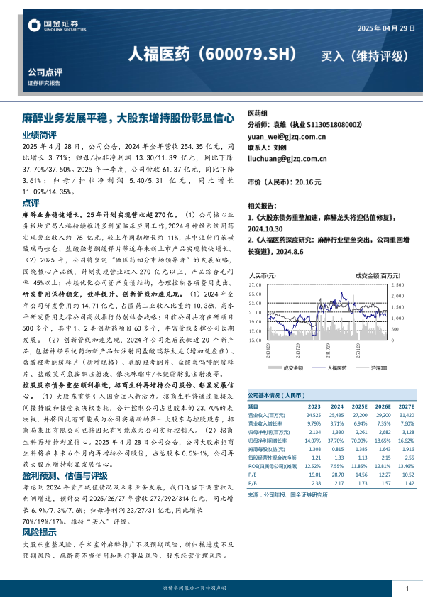 本报告分析了人福医药2024年及2025年一季度的业绩表现,指出公司核心麻醉业务稳健增长,研发投入持续,创新管线加速兑现。控股股东的变更和增持股份也显示了对公司未来发展的信心。报告同时提示了相关风险,并维持了对公司的“买入”评级。