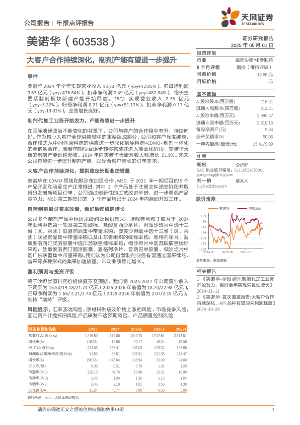 公司通过深化与国际大客户的合作,将合作模式从传统的中间体原料药供应拓展至原料药+CDMO+制剂一体化的全链条服务,有效绑定了核心客户的全球供应链。美诺华天康的制剂产能迅速爬坡,2024年营收大幅增长51.9%,预示着未来制剂产能有望进一步提升以满足客户需求。同时,公司自营制剂产品在国家和省级集中带量采购中频频中标续约,如培哚普利叔丁胺片、盐酸莫西沙星片、阿派沙班片等多个核心产品成功放量,为公司带来了稳定的业绩增量。尽管沙坦类原料药价格恢复不及预期导致盈利预测有所下调,但公司凭借制剂业务的强劲表现和多元化的增长策略,仍维持“增持”评级,展现出其在医药生物/化学制药领域的强大竞争力和发展潜力。