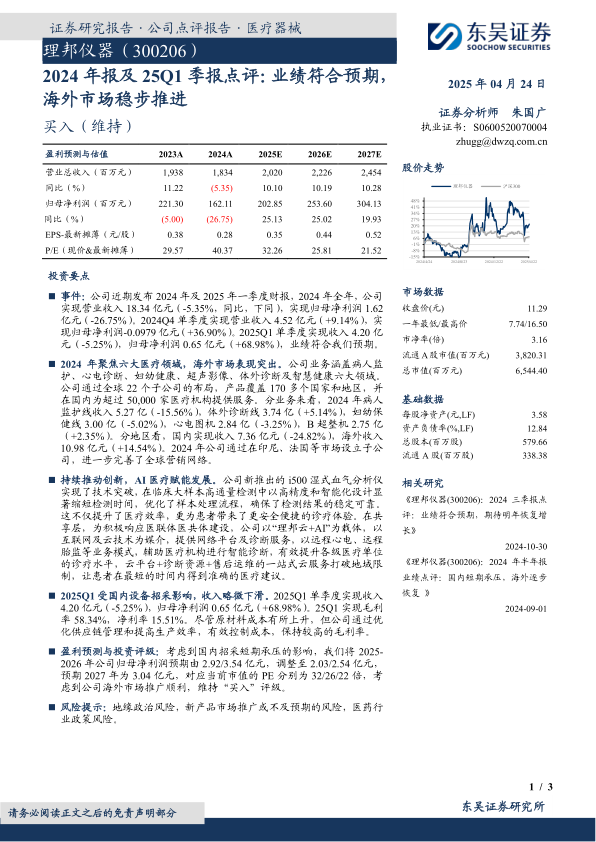 本报告对理邦仪器2024年年报及2025年一季度季报进行了深入分析,指出公司业绩符合预期,海外市场稳步推进,持续推动创新,并以AI医疗赋能发展。尽管国内市场短期承压,但公司通过拓展海外市场和技术创新,有望实现持续增长。维持“买入”评级。