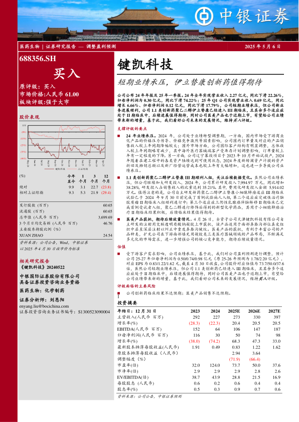 键凯科技短期业绩受到市场因素影响而承压,但公司积极转型,加大研发投入,创新药聚乙二醇伊立替康的临床试验进展顺利,医美产品也成功上市。中银证券维持对公司的“买入”评级,认为公司在创新药和医美领域的布局将带来新的增长动力,但同时也提醒投资者关注创新药临床结果和医美产品销售的风险。