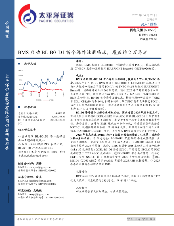 公司在2024年实现营收和净利大幅增长,但预计2025-2027年将面临短期亏损,主要受研发投入和市场拓展影响。尽管短期财务承压,但基于BL-B01D1的全球化布局和潜在市场规模,太平洋证券维持“买入”评级,目标价333.52元,反映了对公司长期价值的认可。
