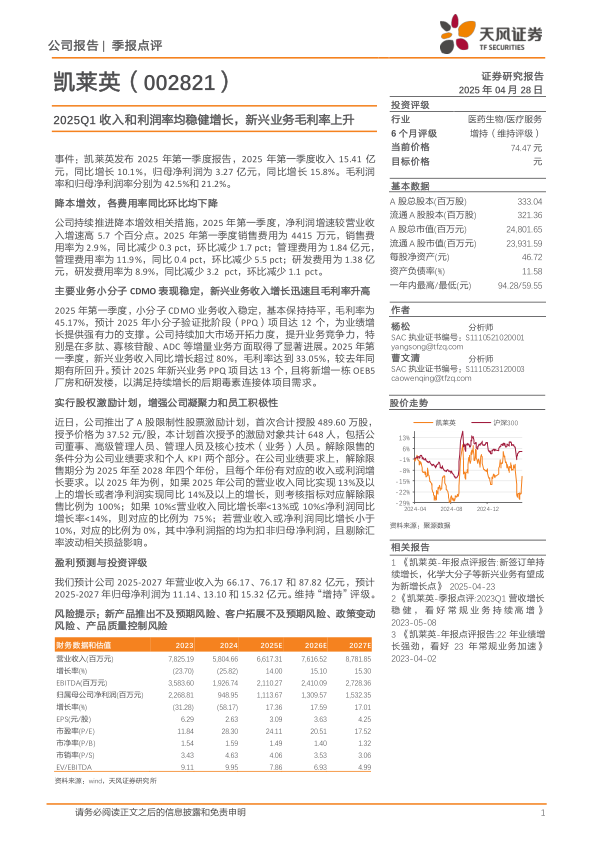 本报告分析表明,凯莱英2025年第一季度业绩稳健增长,盈利能力提升,新兴业务成为新的增长引擎。公司通过股权激励计划,增强了员工凝聚力,为未来的可持续发展奠定了基础。维持“增持”评级,主要基于公司在小分子CDMO业务的稳定表现和新兴业务的快速增长潜力。同时,投资者也应关注新产品推出不及预期、客户拓展不及预期、政策变动以及产品质量控制等风险。