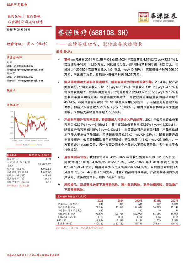 本报告分析了赛诺医疗2024年及2025年Q1的业绩表现,指出公司在集采政策的推动下,冠脉支架业务快速增长,并实现扭亏为盈。同时,公司通过提升产能利用率改善毛利率,并持续投入研发,为未来的发展奠定基础。报告维持对赛诺医疗“买入”的投资评级,并提示了相关风险。