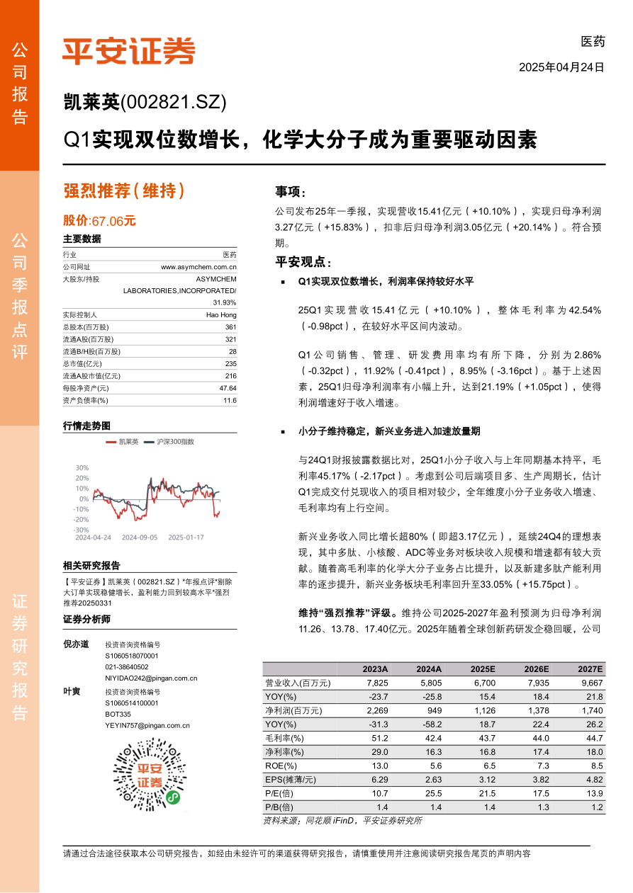 凯莱英2025年一季度营收和利润均实现双位数增长,显示出公司良好的发展势头。其中,新兴业务如多肽、小核酸、ADC等成为重要的增长驱动因素。