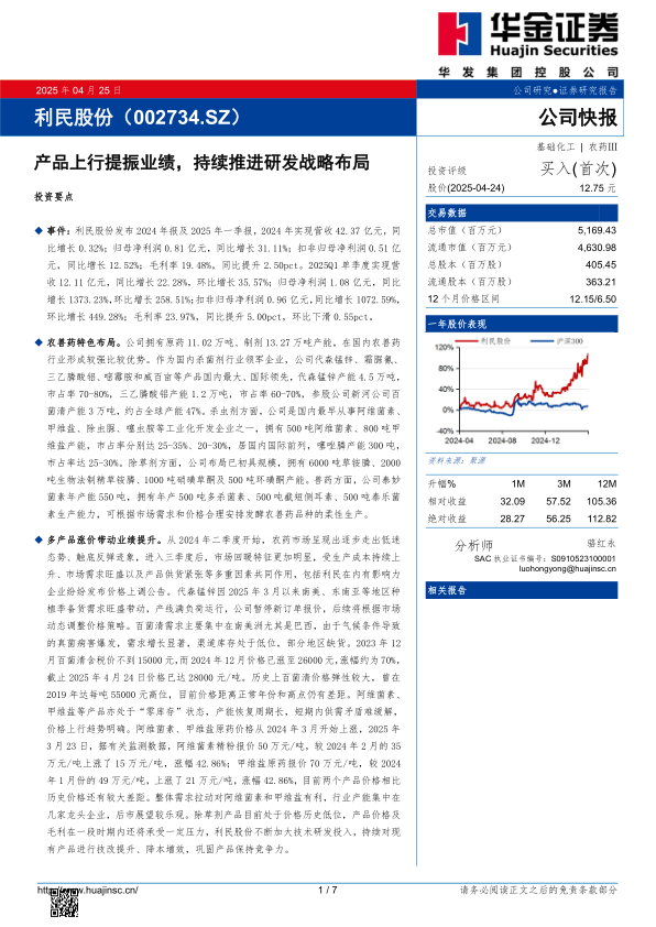 事件:利民股份发布2024年报及2025年一季报,2024年实现营收42.37亿元,同比增长0.32%;归母净利润0.81亿元,同比增长31.11%;扣非归母净利润0.51亿元,同比增长12.52%;毛利率19.48%,同比提升2.50pct。2025Q1单季度实现营收12.11亿元,同比增长22.28%,环比增长35.57%;归母净利润1.08亿元,同比增长1373.23%,环比增长258.51%;扣非归母净利润0.96亿元,同比增长1072.59%,环比增长449.28%;毛利率23.97%,同比提升5.00pct,环比下滑0.55pct。