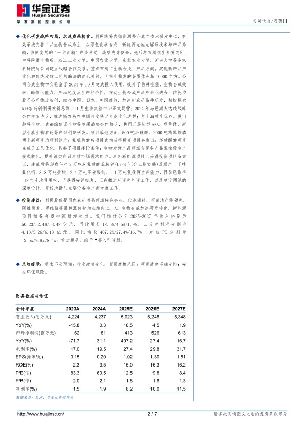 华金证券研究所首次覆盖利民股份,给予“买入”评级。预计公司2025-2027年收入分别为50.23/52.48/53.48亿元,归母净利润分别为4.13/5.26/6.13亿元,同比增长407.2%/27.4%/16.7%。对应PE分别为12.5x/9.8x/8.4x。与可比公司扬农化工、利尔化学、中农立华的平均PE(2025-2027年分别为16.8x/13.2x/11.0x)相比,利民股份的当前估值具有较强的吸引力。公司百菌清、阿维菌素、甲维盐等多产品涨价带来的业绩向上弹性,以及AI+合成生物助力研发转化和工艺优化,共同支撑了其估值优势。