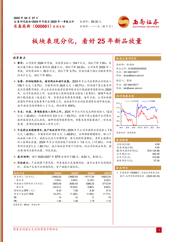 本报告对长春高新(000661)2024年年报及2025年一季报进行了分析,核心观点如下: