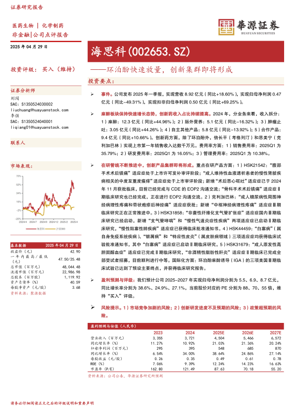 基于公司良好的发展态势和创新药的潜力,华源证券维持海思科“买入”评级,并预测公司未来三年归母净利润将保持快速增长。