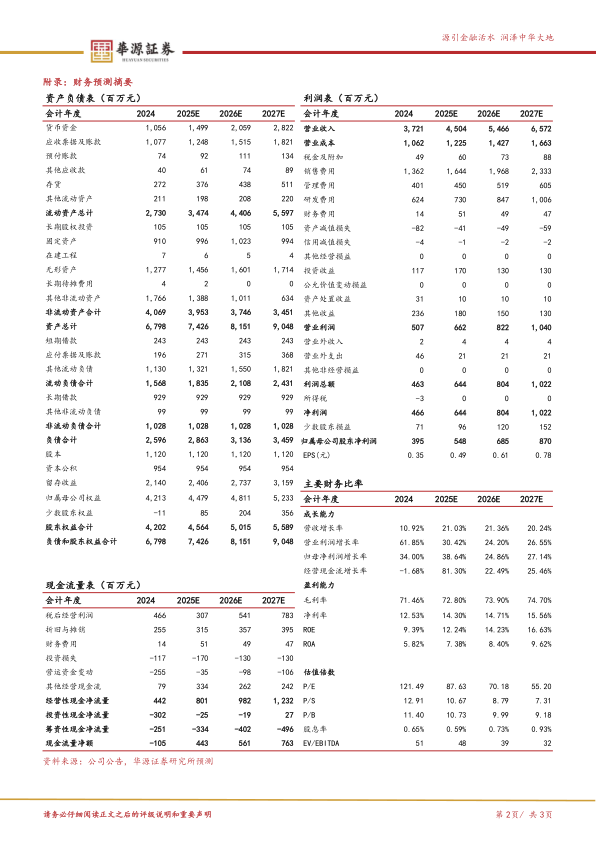 盈利预测与评级:我们预计公司2025-2027年实现归母净利润分别为5.5、6.9、8.7亿元,同比增长率分别为38.6%、24.9%、27.1%,当前股价对应的PE分别为88、70、55倍,维持“买入”评级。