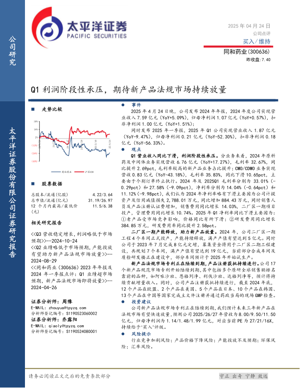 同和药业短期业绩承压,但长期增长潜力巨大。公司通过二厂区产能扩张和积极布局新产品法规市场,有望在未来实现业绩快速增长。 维持“买入”评级,但需关注行业竞争、产品价格、产能投放等风险因素。