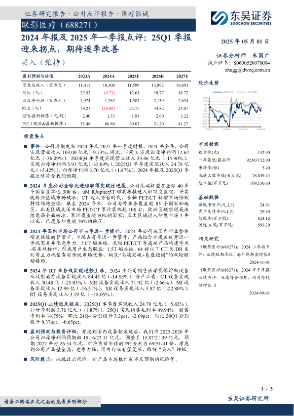 本报告认为,联影医疗2024年业绩承压,但全球化战略取得显著进展,国内市场份额稳步提升。2025年一季度业绩迎来拐点,预示着公司业绩有望逐季改善。维持“买入”评级,建议关注国内行业复苏带来的投资机会。