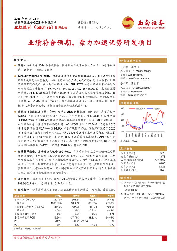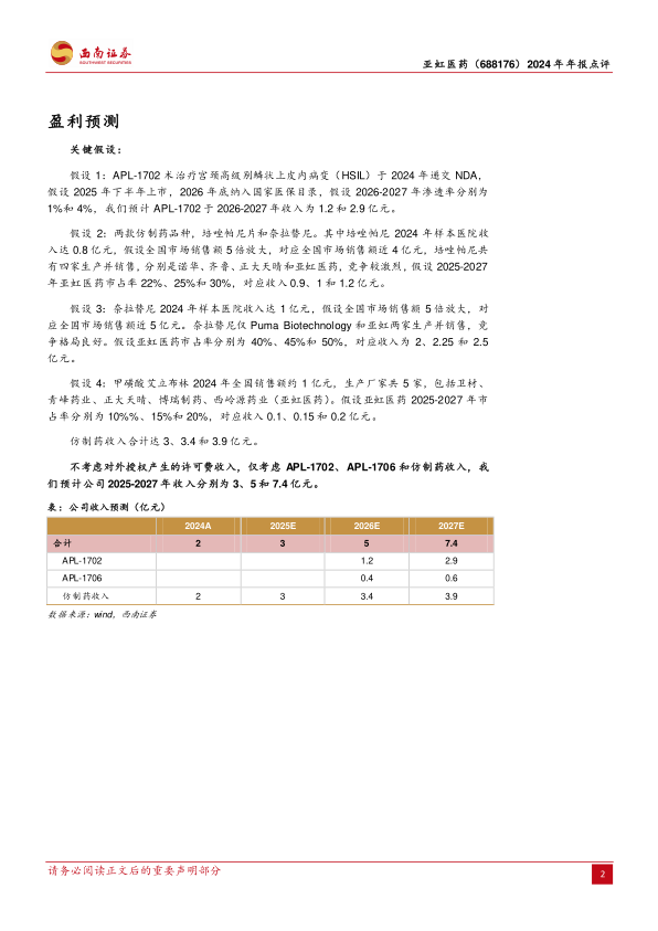 盈利预测:随着APL-1702、APL-1706和仿制药的落地及放量,我们预计公司2025-2027年收入分别为3、5和7.4亿元。