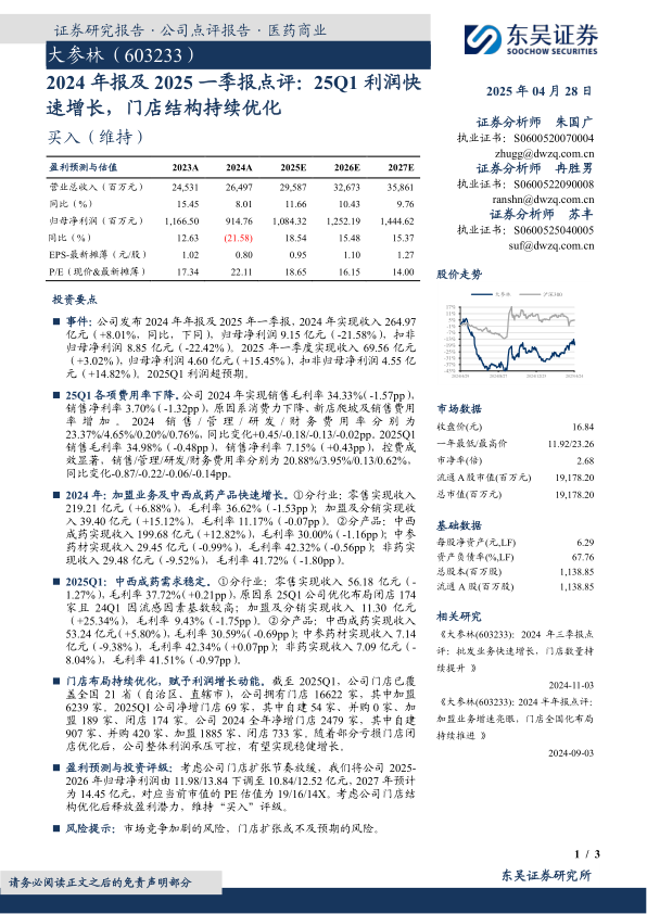 大参林在2024年面临消费力下降和新店爬坡等挑战,导致归母净利润有所下滑。然而,公司在2025年第一季度展现出强劲的复苏势头,归母净利润实现超预期增长,主要得益于显著的费用控制成效和持续优化的门店结构。加盟业务保持快速增长,中西成药需求稳定。尽管门店扩张节奏有所放缓,但通过闭店优化亏损门店,公司整体盈利潜力有望释放。基于门店结构优化后的盈利潜力,分析师维持“买入”评级,并对2025-2027年的归母净利润进行了预测,对应当前市值的PE估值具有吸引力。公司未来发展仍需关注市场竞争加剧及门店扩张不及预期的风险。