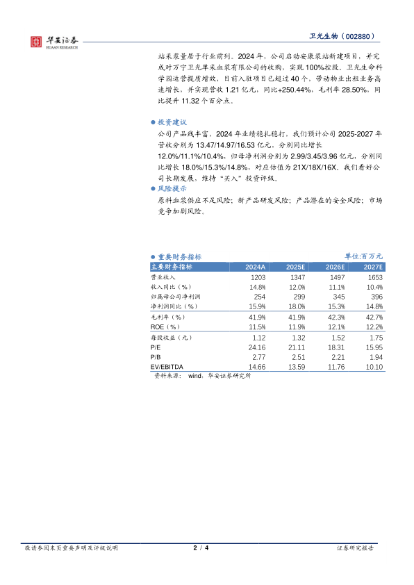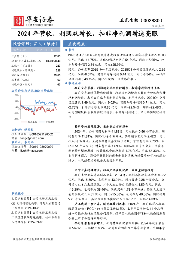 本报告分析了卫光生物2024年的业绩表现,指出公司在营收和利润方面均实现了稳健增长,盈利能力有所提升。公司通过加强费用管控、优化产品结构和拓展浆源,实现了核心竞争力的增强。 报告维持对公司“买入”的投资评级,但同时也提示了原料血浆供应、新产品研发、产品安全以及市场竞争等方面的风险。