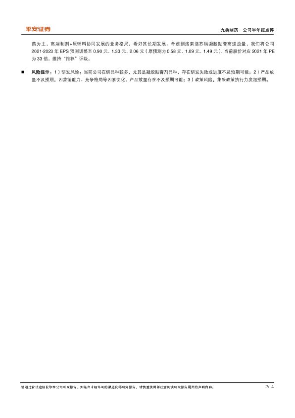 公司聚焦经皮给药蓝海,维持“推荐”评级:目前公司已经形成以经皮给药为主,高端制剂+原辅料协同发展的业务格局,看好其长期发展。考虑到洛索洛芬钠凝胶贴膏高速放量,我们将公司2021-2023 年 EPS 预测调整至 0.90 元、1.33 元、2.06 元(原预测为 0.58 元、1.09 元、1.49 元),当前股价对应 2021 年 PE为 33 倍,维持“推荐”评级。