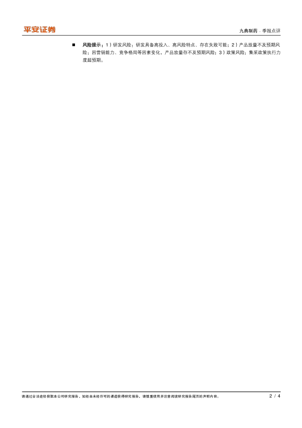 风险提示:1)研发风险:研发具备高投入、高风险特点、存在失败可能;2)产品放量不及预期风险:因营销能力、竞争格局等因素变化,产品放量存不及预期风险;3)政策风险:集采政策执行力度超预期。
