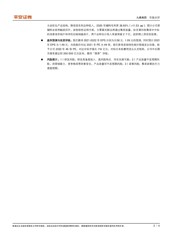 盈利预测与投资评级:我们维持2021-2022年EPS分别为0.58元、1.09元的预测,同时预计2021年EPS为1.49元,当前股价对应2021年PE为49倍。我们参考其他特色细分领域龙头估值,给予公司2022年45倍PE,对应目标市值为116亿元。对标日本贴膏剂龙头久光制药,公司中长期市值有望达到300-500亿元区间,维持“推荐”评级。
