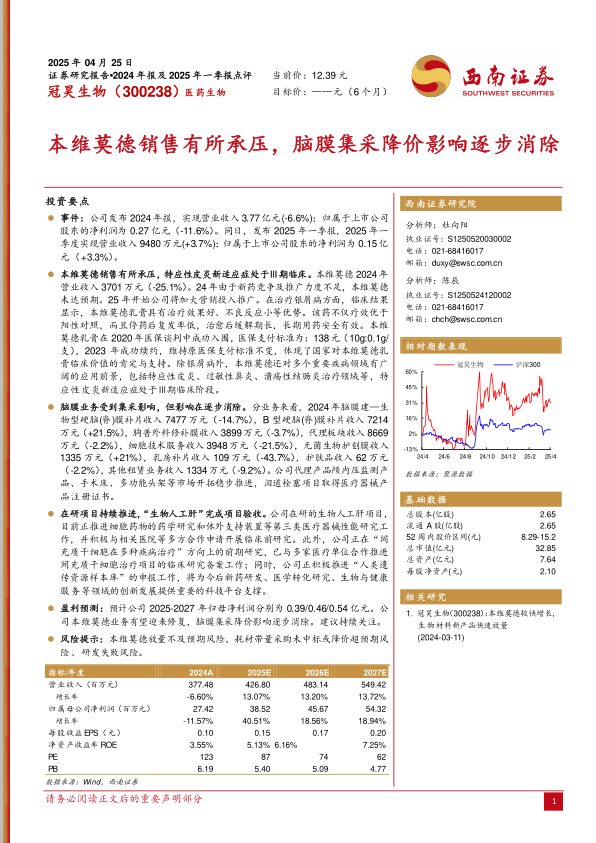 本报告对冠昊生物(300238)2024年报及2025年一季报进行了深入分析,核心观点如下: