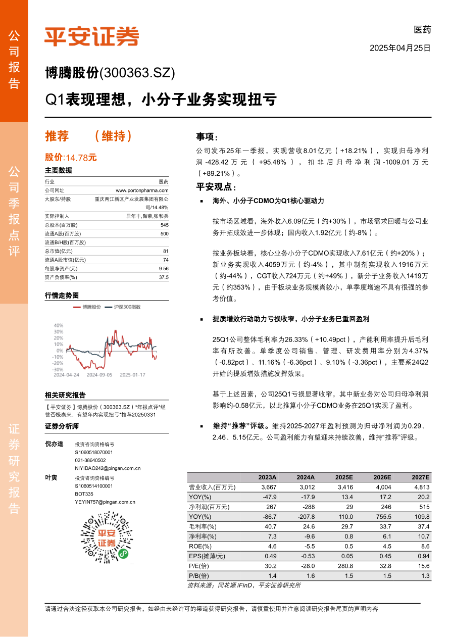 博腾股份2025年一季报显示,公司营收实现增长,亏损显著收窄,小分子CDMO业务扭亏为盈,海外市场表现强劲。提质增效措施的实施和产能利用率的提升是盈利能力改善的关键因素。维持“推荐”评级,并预计公司盈利能力有望持续改善。但同时也需关注地缘政治、行业发展、药品研发和生产安全等风险因素。