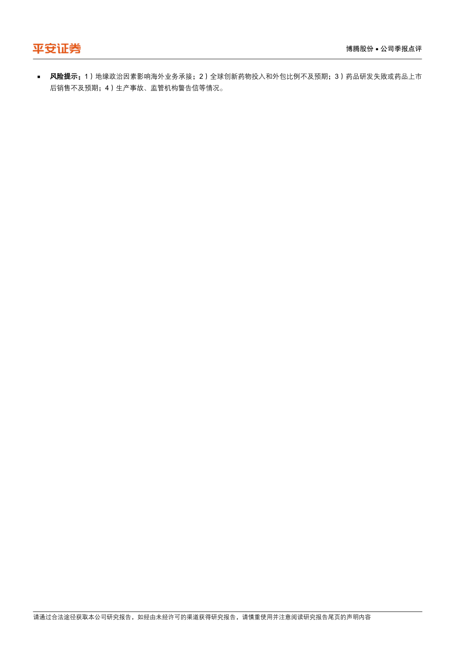 风险提示:1)地缘政治因素影响海外业务承接;2)全球创新药物投入和外包比例不及预期;3)药品研发失败或药品上市后销售不及预期;4)生产事故、监管机构警告信等情况。