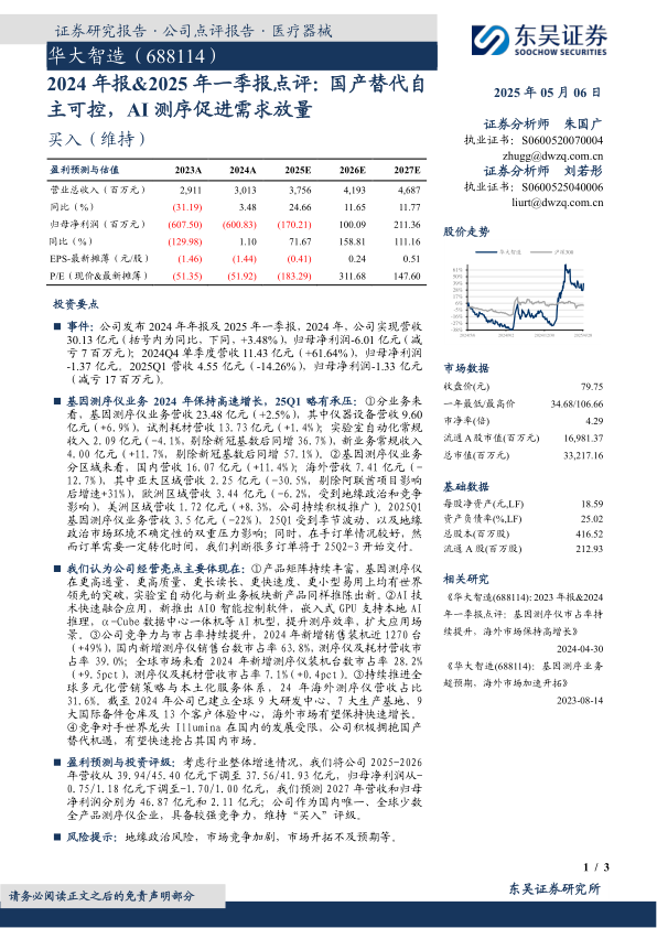 华大智造在2024年通过基因测序仪业务的稳健增长和产品创新,尤其是在AI技术融合应用及全球化布局方面取得了显著进展,市场份额持续提升。尽管2025年第一季度业绩面临短期压力,但公司积极把握国产替代机遇,并具备强大的核心竞争力。报告维持“买入”评级,认为公司有望克服短期挑战,实现长期增长。