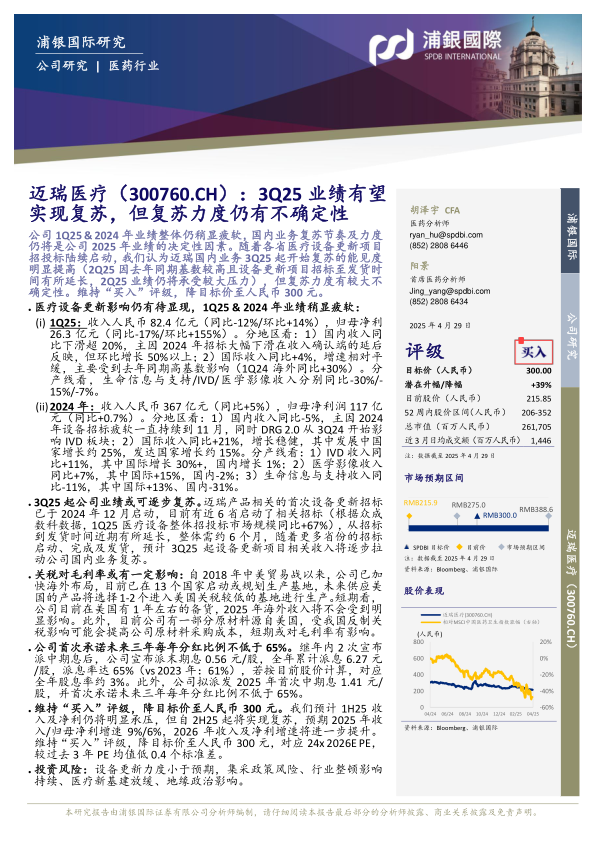 本报告分析了迈瑞医疗1Q25和2024年的业绩表现,指出短期内业绩承压,但长期来看,受益于医疗设备更新项目的启动,公司业绩有望在3Q25起逐步复苏。尽管面临关税和集采政策等风险,公司积极应对,并通过海外布局和提高分红比例等措施来提升盈利能力和股东回报。维持“买入”评级,但考虑到复苏力度的不确定性,将目标价下调至人民币300元。投资者应关注设备更新项目的进展、集采政策的影响以及地缘政治风险。