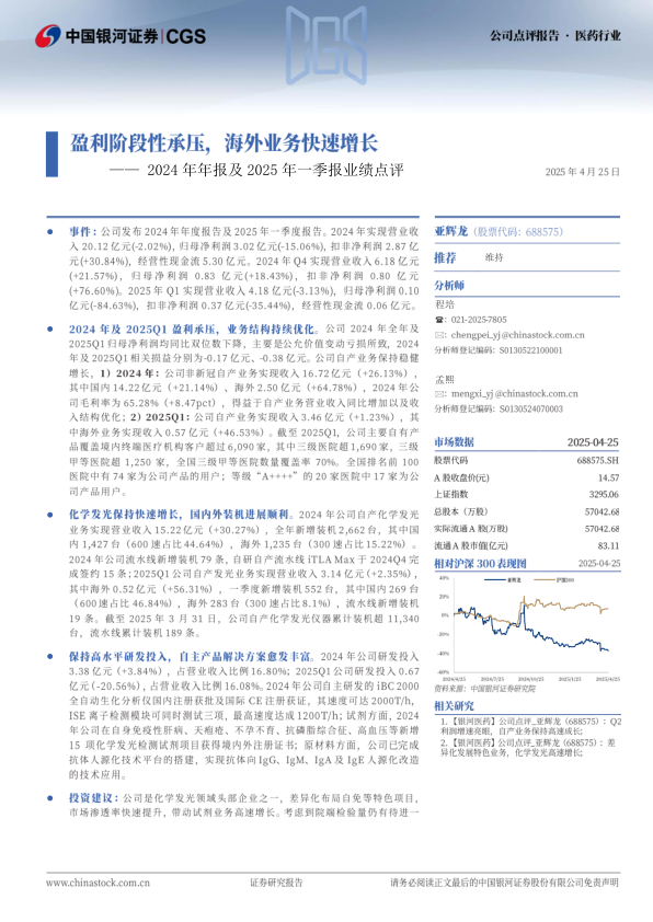 2024年及2025Q1盈利承压,业务结构持续优化。公司2024年全年及2025Q1归母净利润均同比双位数下降,主要是公允价值变动亏损所致,2024年及2025Q1相关损益分别为-0.17亿元、-0.38亿元。公司自产业务保持稳健增长,1)2024年:公司非新冠自产业务实现收入16.72亿元(+26.13%),其中国内14.22亿元(+21.14%)、海外2.50亿元(+64.78%),2024年公司毛利率为65.28%(+8.47pct),得益于自产业务营业收入同比增加以及收入结构优化;2)2025Q1:公司自产业务实现收入3.46亿元(+1.23%),其中海外业务实现收入0.57亿元(+46.53%)。截至2025Q1,公司主要自有产品覆盖境内终端医疗机构客户超过6,090家,其中三级医院超1,690家,三级甲等医院超1,250家,全国三级甲等医院数量覆盖率70%。全国排名前100医院中有74家为公司产品的用户;等级“A++++”的20家医院中17家为公司产品用户。