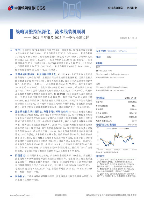 投资建议:公司是技术实力领先、产品布局全面的头部IVD企业,高速机及流水线解决方案快速落地为公司提供长期增长动力。考虑到IVD行业集采逐步落地执行、院端检验量仍有待进一步修复,我们调整并预计公司2025-2027年归母净利润至3.09/3.73/4.48亿元,同比增长143.64%/20.58%/20.13%,每股EPS分别为0.50/0.61/0.73元,当前股价对应2025-2027年PE23/19/16倍,维持“推荐”评级。