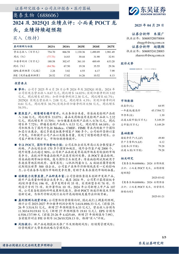 奥泰生物2024年及2025年一季度业绩表现亮眼,营收和净利润均实现显著增长。报告分析了公司业绩增长的主要驱动因素,包括聚焦客户、销售增长、国际市场影响力以及创新能力。