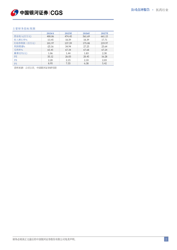 研发转化构建第二增长曲线,高比例分红彰显长期信心。公司坚持研发创新,产品管线持续丰富:自动导航经颅磁刺激仪MagNeuroONE系列产品顺利完成取证和产品上市;冲击波产品顺利取证上市销售;Nd:YAG倍频超皮秒激光治疗仪(即PicoV)获国家药品监督管理局批准,取得三类医疗器械注册证,为国内首台通过顶级医院大规模注册临床试验验证的治疗色素性疾病的超皮秒产品。此外,公司2024年现金分红比例为88.45%(每10股派8元),较高比例的分红体现公司对盈利质量及转型前景的信心。2025年4月25日,公司发布《2025年限制性股票激励计划(草案)》,以2024年营业收入为基数,2025年及2026年营业收入增长率分别不低于18%(计算值4.72亿元)、40%(计算值5.6亿元),该激励计划拟授予激励对象的限制性股票数量为100.00万股,约占公司股本总额的1.04%。