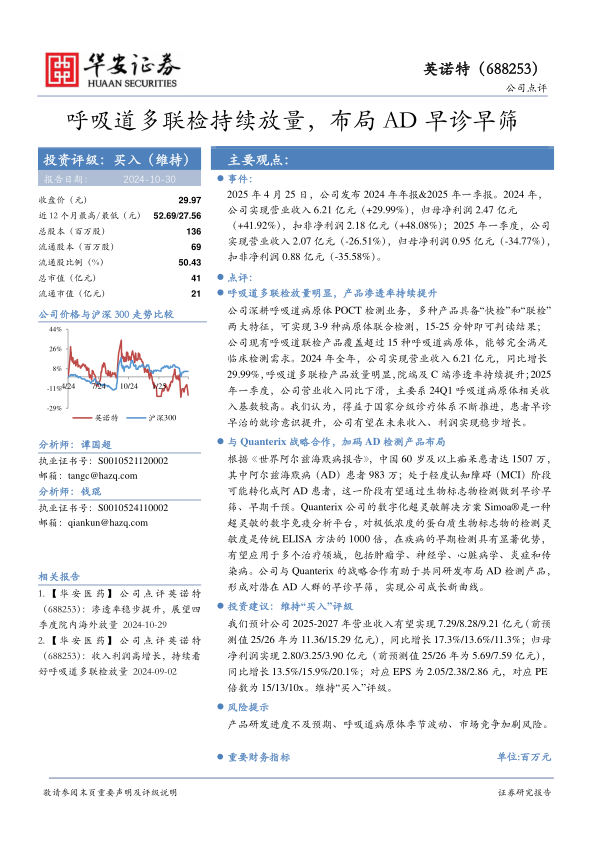本报告分析了英诺特公司2024年年报和2025年一季报的业绩,强调了呼吸道多联检产品放量对公司业绩的积极影响,并指出与Quanterix的战略合作将有助于公司在AD早诊早筛领域形成新的增长点。维持“买入”评级,并给出了未来几年的业绩预测。同时,报告也提示了相关风险。