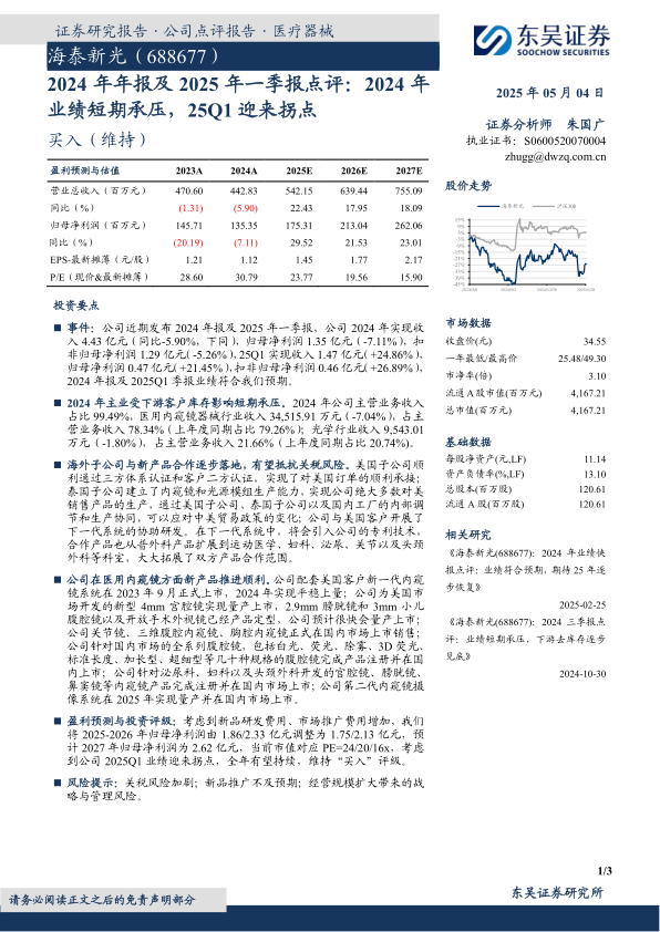 海泰新光2024年业绩虽短期承压,但2025年一季度已现拐点。海外子公司布局和新产品合作将有效应对关税风险,并拓展产品应用范围,为公司长期增长提供动力。