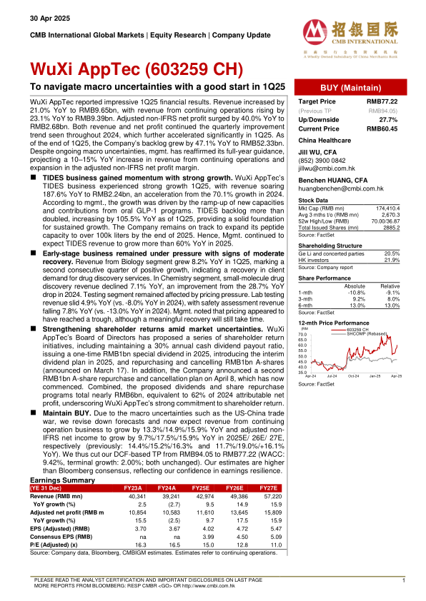 WuXi AppTec reported impressive 1Q25 financial results. Revenue increased by21.0% YoY to RMB9.65bn, with revenue from continuing operations rising by23.1% YoY to RMB9.39bn. Adjusted non-IFRS net profit surged by 40.0% YoY toRMB2.68bn. Both revenue and net profit continued the quarterly improvementtrend seen throughout 2024, which further accelerated significantly in 1Q25. Asof the end of 1Q25, the Company’s backlog grew by 47.1% YoY to RMB52.33bn.Despite ongoing macro uncertainties, mgmt. has reaffirmed its full-year guidance,projecting a 10–15% YoY increase in revenue from continuing operations andexpansion in the adjusted non-IFRS net profit margin.