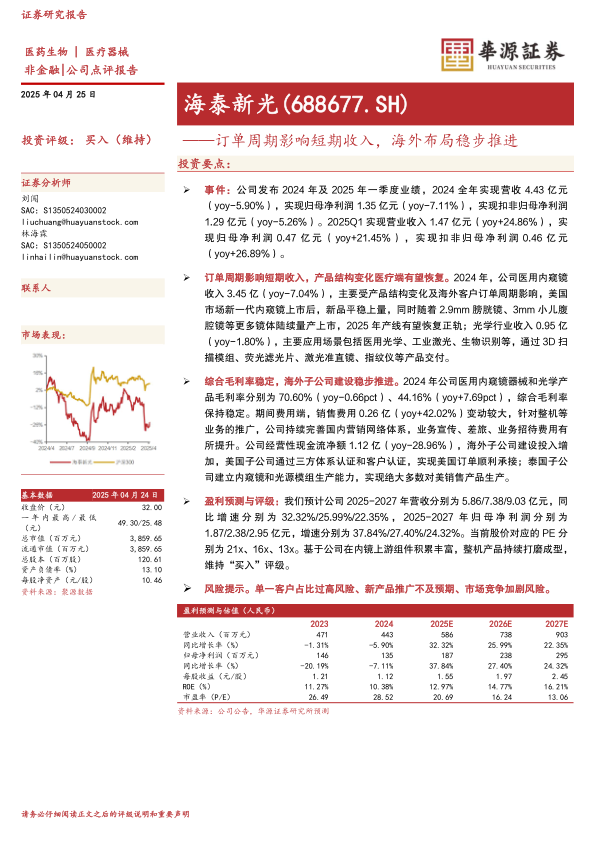尽管收入短期波动,公司综合毛利率保持稳定,其中光学产品毛利率显著提升。海泰新光积极推进全球化战略,通过在美国和泰国设立子公司,成功打通海外订单承接和生产能力,为未来国际市场拓展奠定坚实基础。基于公司在内镜上游组件的深厚积累和整机产品的持续开发,分析师维持“买入”评级,看好其长期发展潜力。