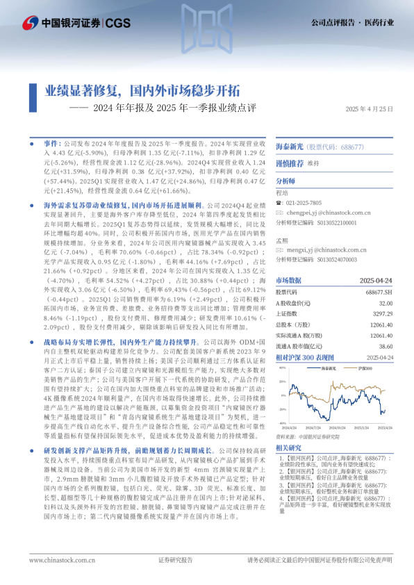2024年年报及2025年一季报业绩点评:业绩显著修复,国内外市场稳步开拓