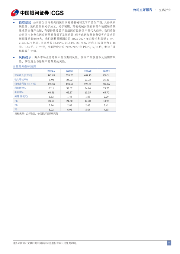 投资建议:公司作为国内领先的医用内窥镜器械和光学产品生产商,具备从系统设计、光机设计到光学加工、光学镀膜、精密机械封装再到部件装配和系统集成的完备产业链,有望持续受益于高端医疗设备国产替代大趋势。我们看好公司国内业务在医疗新基建背景下发展前景,但考虑到海外业务受客户需求的周期波动影响较大,我们调整并预测公司2025-2027年归母净利润至1.79、2.23、2.76亿元,同比增长32.02%、24.84%、23.75%,对应EPS分别为1.48元、1.85元、2.29元,当前股价对应2025-2027年PE 22/17/14倍,维持“谨慎推荐”评级。