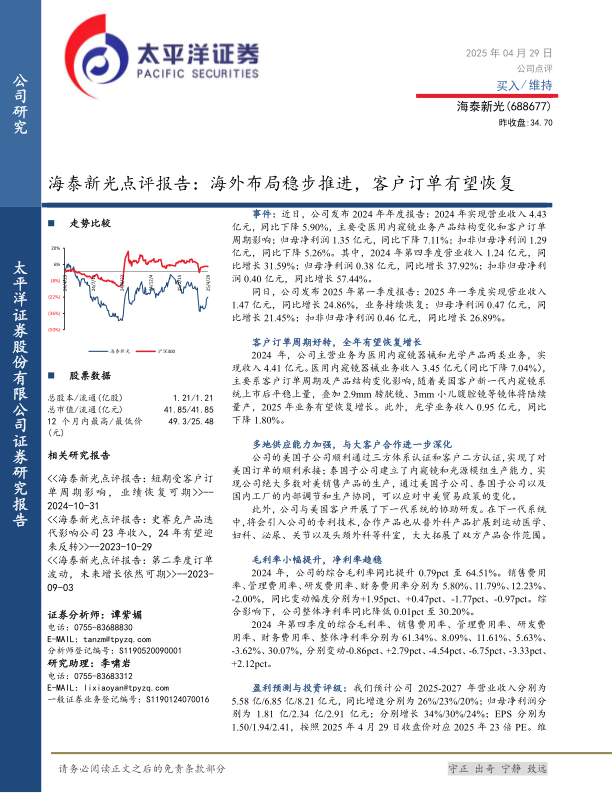 基于对公司业务恢复和国际化战略的积极展望,我们预计海泰新光2025-2027年营业收入将分别达到5.58亿元、6.85亿元和8.21亿元,同比增速分别为26%、23%和20%。归母净利润预计分别为1.81亿元、2.34亿元和2.91亿元,分别同比增长34%、30%和24%。摊薄每股收益(EPS)预计为1.50元、1.94元和2.41元。按照2025年4月29日收盘价计算,对应2025年市盈率为23倍。鉴于公司业绩的恢复性增长、海外布局的稳步推进以及与大客户合作的深化,我们维持对海泰新光的“买入”评级。