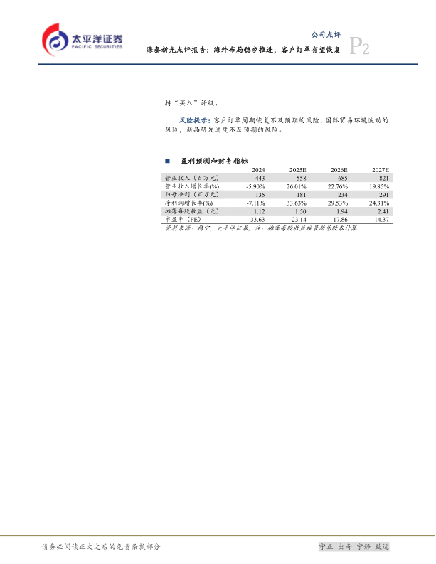 风险提示:客户订单周期恢复不及预期的风险,国际贸易环境波动的风险,新品研发进度不及预期的风险。