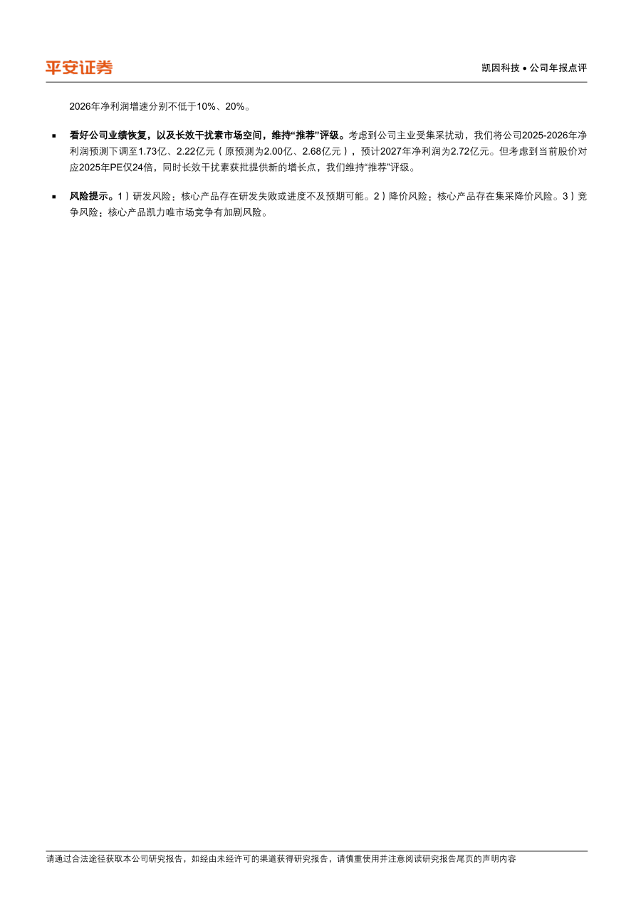 本报告对凯因科技进行了全面的分析,认为公司短期业绩受集采和销售模式调整影响,但长期来看,随着集采产品终端覆盖率提升和销售模式调整结束,收入增速有望回升。同时,公司高比例的研发投入和长效干扰素的获批预期将为公司带来新的增长点。员工持股计划彰显了公司发展信心。因此,平安证券维持对凯因科技的“推荐”评级。投资者应关注研发风险、降价风险和竞争风险。